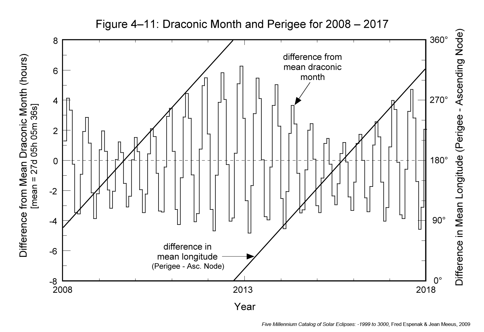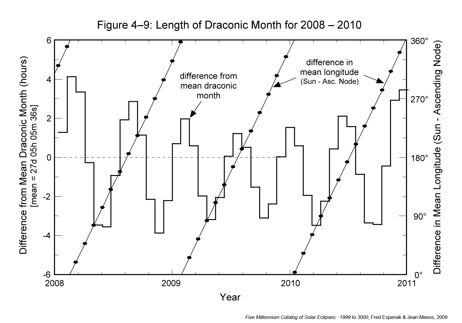 The most significant characteristic of this variation is that it is synchronized with the ascending node relative to the Sun's position along the ecliptic. The mean angle between the Sun and the ascending node (i.e., difference in mean longitude) is also plotted in Figure 4-9 (diagonal lines) to illustrate this relationship. The longitude difference at the start of each draconic month is plotted as a black dot. Longitude values can be read using the scale along the right side of the figure. The longest draconic months occur when the difference in the mean longitudes of the Sun and the ascending node is either 0° or 180°. In contrast, the shortest months occur when the angle between the Sun and the ascending node is either 90° or 270°.