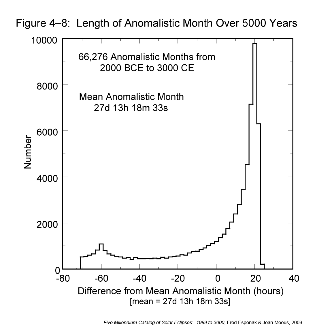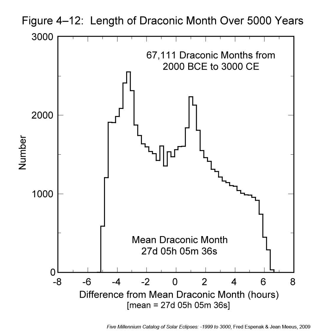 There are 67,111 draconic months during the 5000 years covered in this catalog. The shortest and longest months are 27.004 days (0.208 days or 5.0 hours shorter than the mean) and 27.487 days (0.275 days or 6.6 hours longer than the mean), respectively. A histogram of the distribution in the length of the draconic month over the five millennia appears in Figure 4-12 where the duration of individual draconic months have been binned into 30-min groups. The width and bifurcated symmetry of the distribution resemble the distribution for the lunation (synodic month) in Figure 4-4.