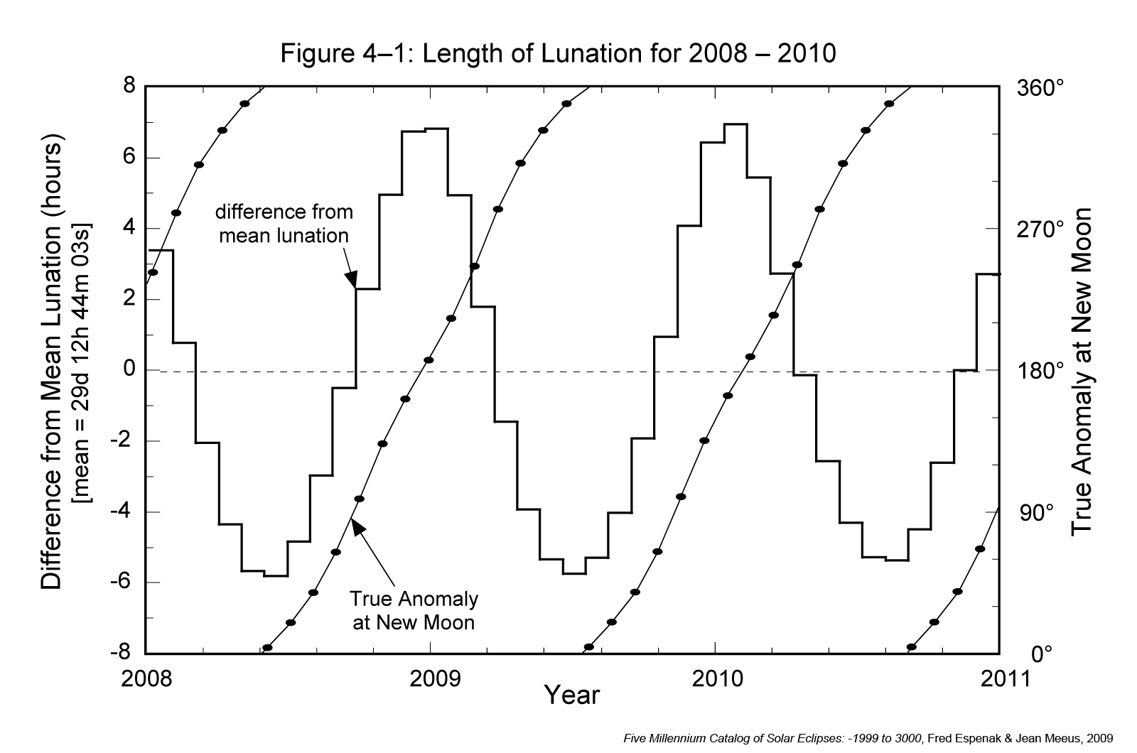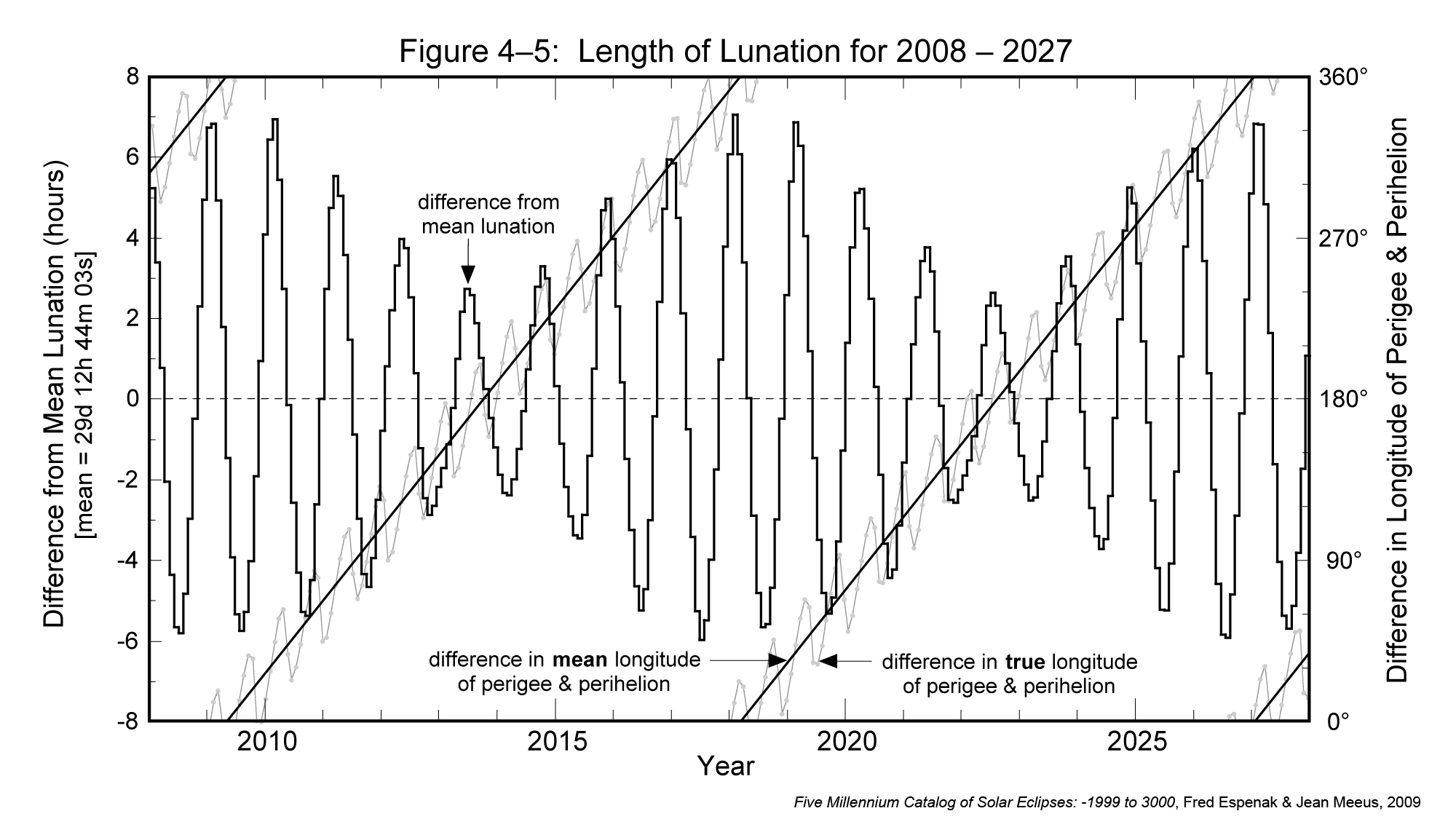 The length of each lunation minus the mean lunation is plotted in Figure 4-5 for the 20-year period from 2008 through 2027. The periodic rhythm between the lunation length and the true anomaly, as described earlier (via Figure 4-1), can now be seen over the course of two decades. The 412-day mean period of this cycle corresponds to the time between two consecutive alignments of the major axis in the direction of the Sun. It is slightly longer than a year because of the slow eastward shift of the Moon's major axis.