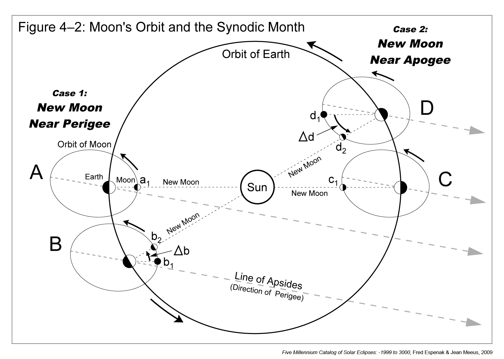 The second case takes place about half a year later. New Moon then occurs near apogee (orbit C, position c1). After one anomalistic month, the Moon has returned to the same location with respect to apogee (orbit D, position d1). Once again, Earth has traveled about 30° around its orbit so the Moon must revolve an additional distance of Δd before reaching the New Moon phase at position d2.