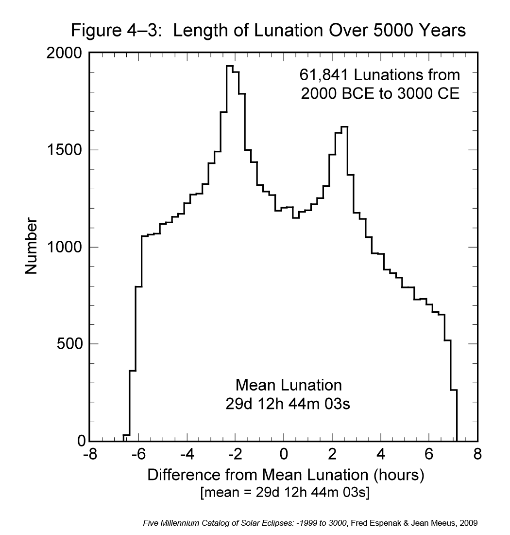 The histogram presented in Figure 4-3 shows the distribution in the length of the lunation over 5000 years. To create the histogram, the durations of individual lunations were binned into 30-minute groups. It might seem reasonable to expect a simple bell-shaped Gaussian curve. However, the results are surprising because the distribution in lunation length has two distinct peaks. This bifurcation can be understood if the lunation length, which depends primarily on the Moon's distance, is considered as a series of sine functions. The extremes of a sine function always occur more frequently than the mean, which is just what is seen in Figure 4-3. For a more detailed discussion, see Meeus (1997).