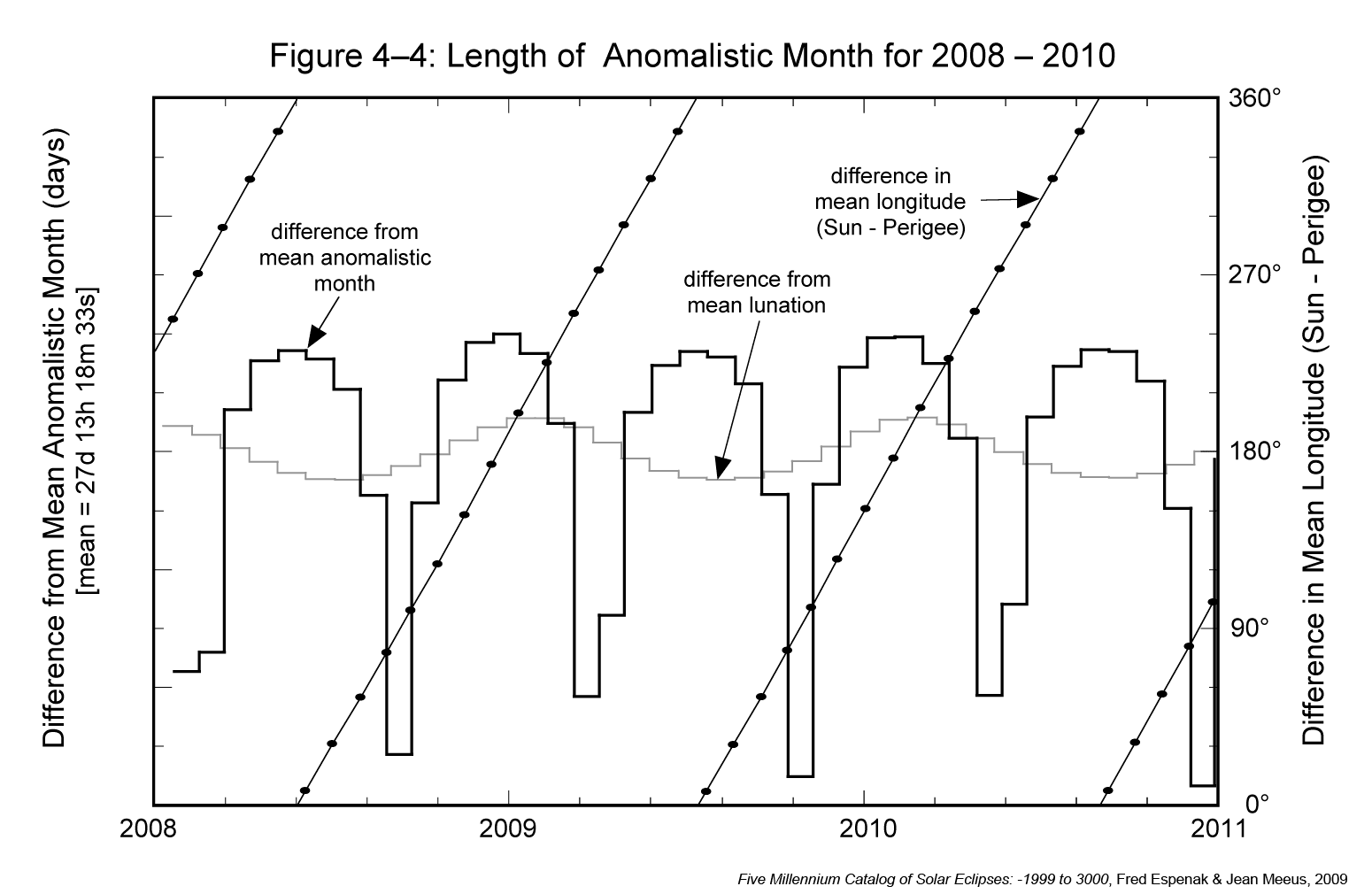 The anomalistic month is defined as the revolution of the Moon around its elliptical orbit as measured from perigee to perigee. The length of this period can vary by several days from its mean value of 27.55455 days (27d 13h 18m 33s). Figure 4-4 plots the difference of the anomalistic month from the mean value for the 3-year interval 2008 through 2010. Also plotted is the difference between the mean longitudes of the Sun and perigee. This is just the angle between the Sun and the Moon's major axis in the direction of perigee. The left-hand scale is the length of the anomalistic month minus the mean value, while the right-hand scale is for the difference in longitude (Sun-perigee). For comparison, the lunation length minus its mean value is also plotted (light gray).