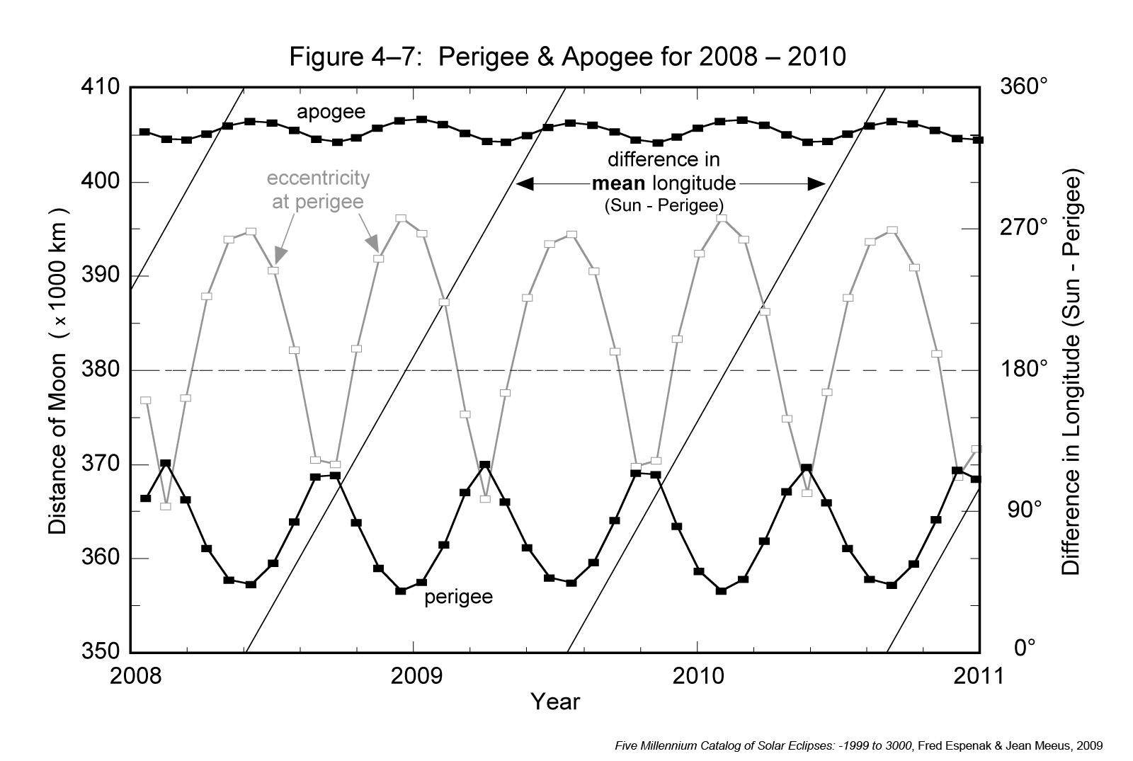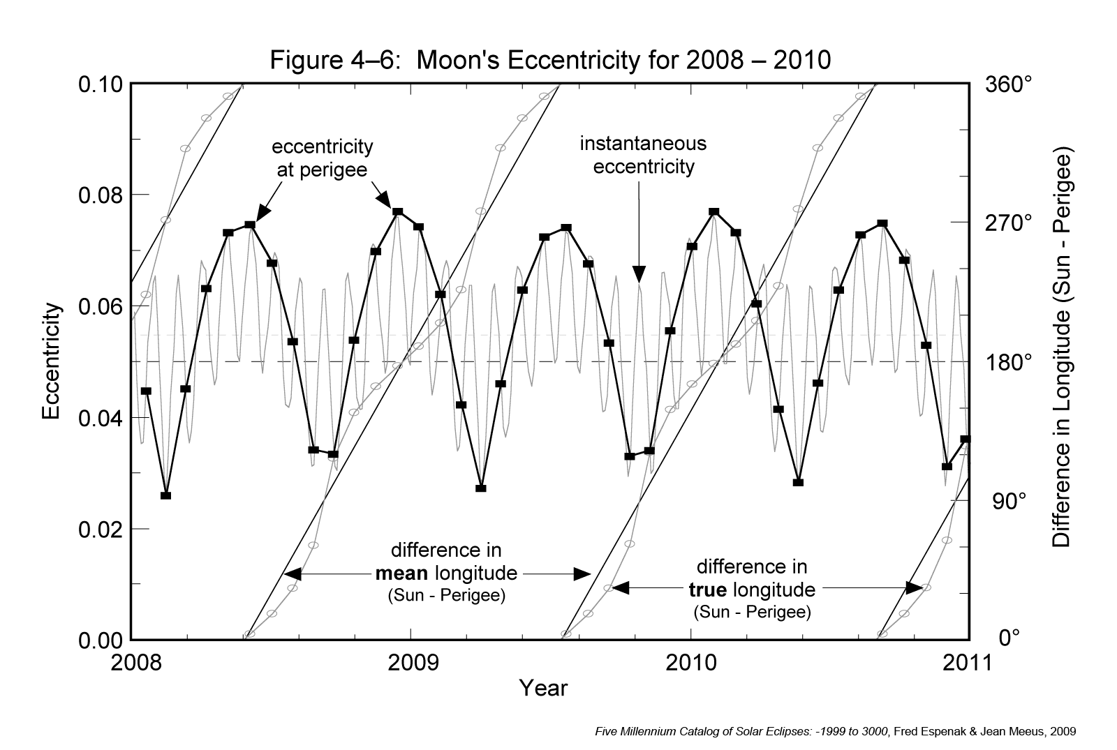 It was stated earlier that the Moon's mean orbital eccentricity is 0.0549, but this too is subject to large changes because of solar perturbations. Figure 4-6 plots the variation in the Moon's orbital eccentricity from 2008 through 2010. The instantaneous eccentricity (light gray curve) oscillates with a period tied to the synodic month and ranges from 0.0266 to 0.0762 over this 3-year interval. Superimposed on the instantaneous eccentricity is the eccentricity at the instant of perigee, which occurs at the beginning of each anomalistic month (heavy black curve). The straight diagonal lines represent the difference between the mean longitudes of the Sun and perigee. In other words, it is the angle between the Moon's perigee-directed major axis and the Sun. Oscillating about this line is the difference between the true longitudes of Sun and perigee. The scale for these angles appears along the right side of Figure 4-6. The extreme range of the Moon's orbital eccentricity at perigee during the 5000 years covered by the catalog is 0.0255 to 0.0775.
