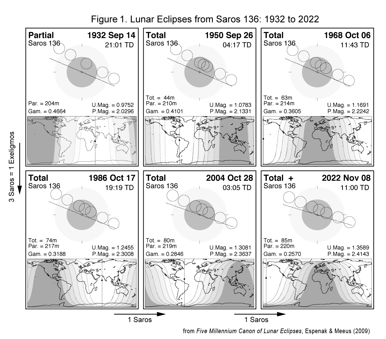 Figure 1 shows the path of the Moon through Earth's shadows and the geographic regions of visibility for six lunar eclipses belonging to Saros 136 from 1932 through 2022. The 1932 Sep 14 eclipse was a large magnitude partial eclipse with a visibility zone centered on eastern Europe and Africa. One Saros period later the eclipse was total (1950 Sep 26) with visibility centered on the Americas. After another Saros interval, the eclipse was a larger magnitude event centered on the Pacific Ocean (1968 Oct 06). Finally, after the lapse of one more Saros period (3 Saros = Exeligmos = ~54.1 years), the zone of visibility returned to eastern Europe and Africa with a deeper non-central total lunar eclipse (1986 Oct 17). The same 54.1-year time interval in geographic visibility repeats for the Americas (1950 and 2004) and for the Pacific (1968 and 2022). The westward migration in the zone of eclipse visibility illustrates the effect of the extra 1/3-day in the Saros period. The southward shift of the Moon's path with respect to the shadow axis is due to the progressive decrease in gamma from 0.4664 (1932) to 0.2570 (2022). During this interval, lunar eclipses in the series change from partial (1932) to non-central total (1950) to central total (2022). Although the Moon's path through Earth's shadows is similar from one eclipse to the next, it is not exact. The Moon-shadow geometry changes slowly as do the characteristics of each lunar eclipse in a Saros series.