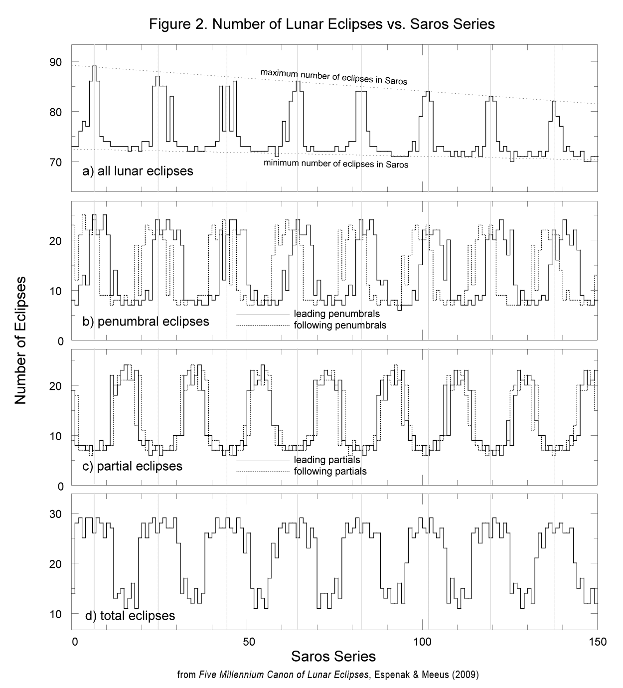 To generalize these relationships, it appears that Saros series that are rich in the number of total eclipses are also rich in the number of penumbral eclipses, but poor in the number of partial eclipses. Conversely, Saros series poor in total eclipses are also poor in penumbral eclipses, but rich in partial eclipses. Finally, Saros series with large numbers of eclipses are centered on series with large numbers of total eclipses. Figure 2a also shows that the extremes in the minimum and maximum numbers of lunar eclipses in a Saros series is gradually decreasing.