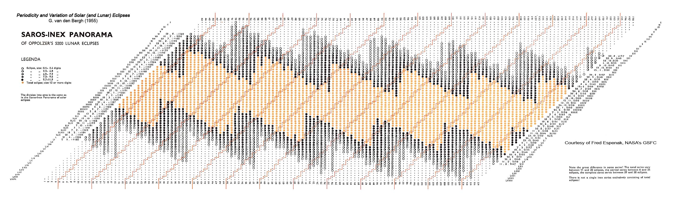 Van den Bergh placed all 5,200 lunar eclipses in von Oppolzer's Canon der Finsternisse (1887) into a large two-dimensional matrix. (Von Oppolzer did not include penumbral lunar eclipses in his Canon der Finsternisse.) Each Saros series was arranged as a separate column containing every eclipse in chronological order. The individual Saros columns were then staggered so that the horizontal rows each corresponded to a different Inex series. This "Saros-Inex Panorama" proved useful in organizing eclipses. For instance, one step down in the panorama is a change of one Saros period (6585.32 days) later, while one step to the right is a change of one Inex period (10571.95 days) later. The rows and columns were then numbered with the Saros and Inex numbers.