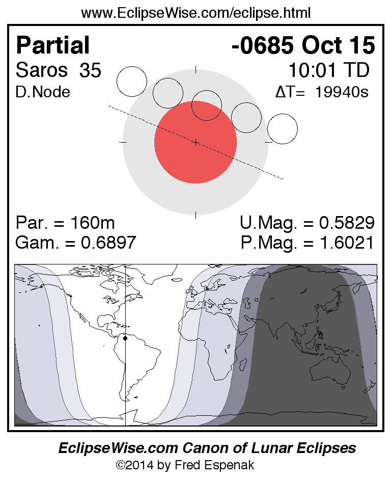 The instant of greatest eclipse takes place on -0685 Oct 15 at 10:00:38 TD (04:28:20 UT1).