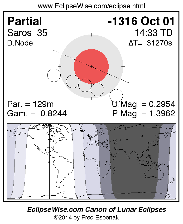 The instant of greatest eclipse takes place on -1316 Oct 01 at 14:33:11 TD (05:52:05 UT1).