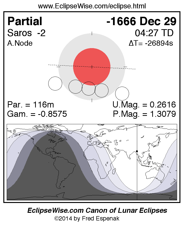 The instant of greatest eclipse takes place on -1666 Dec 29 at 04:26:35 TD (17:42:38 UT1).