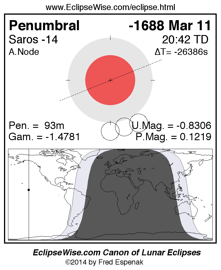 The instant of greatest eclipse takes place on -1688 Mar 11 at 20:41:50 TD (09:49:26 UT1).