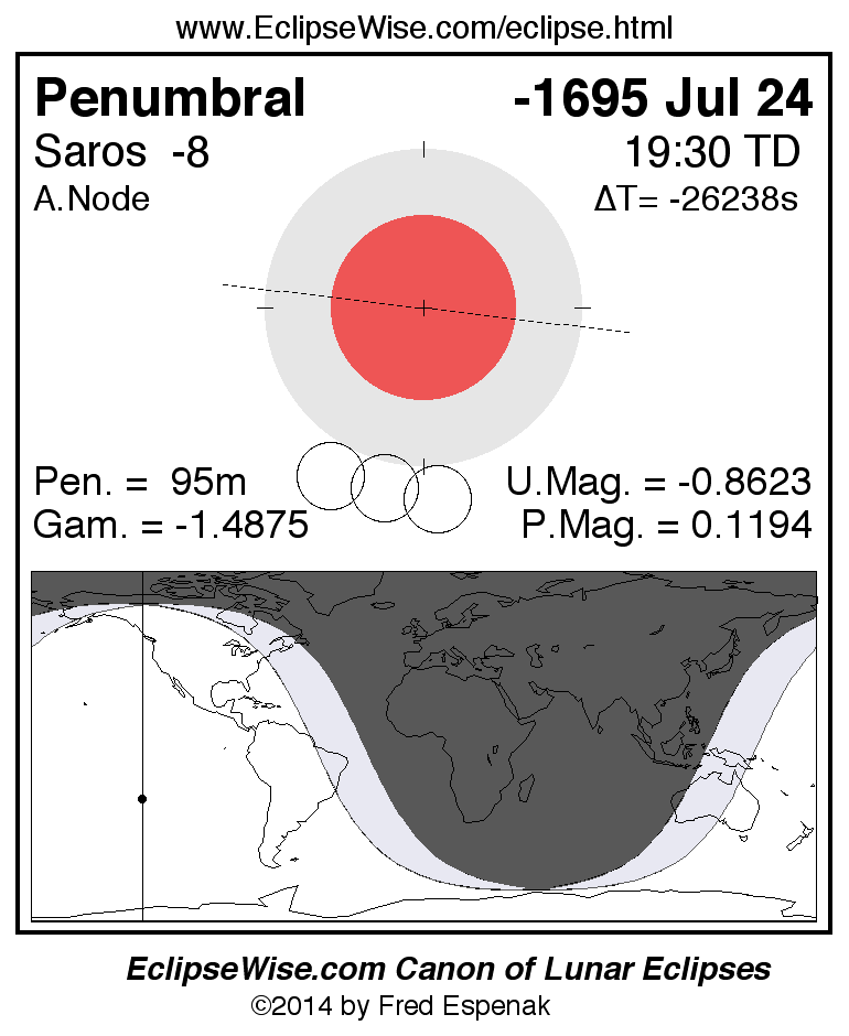 Another lunar eclipse occurs one synodic month after the -1695 Jul 24 eclipse. It is the penumbral lunar eclipse of -1695 Aug 23.