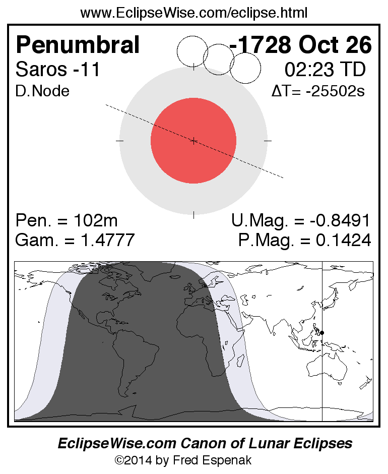 Another lunar eclipse occurs one synodic month after the -1728 Oct 26 eclipse. It is the penumbral lunar eclipse of -1728 Nov 24.