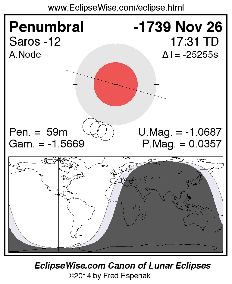 Another lunar eclipse occurs one synodic month after the -1739 Nov 26 eclipse. It is the penumbral lunar eclipse of -1739 Dec 26.