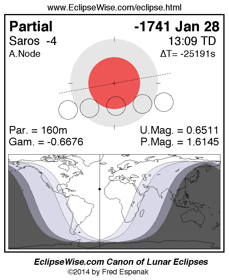 The instant of greatest eclipse takes place on -1741 Jan 28 at 13:09:16 TD (01:56:56 UT1).