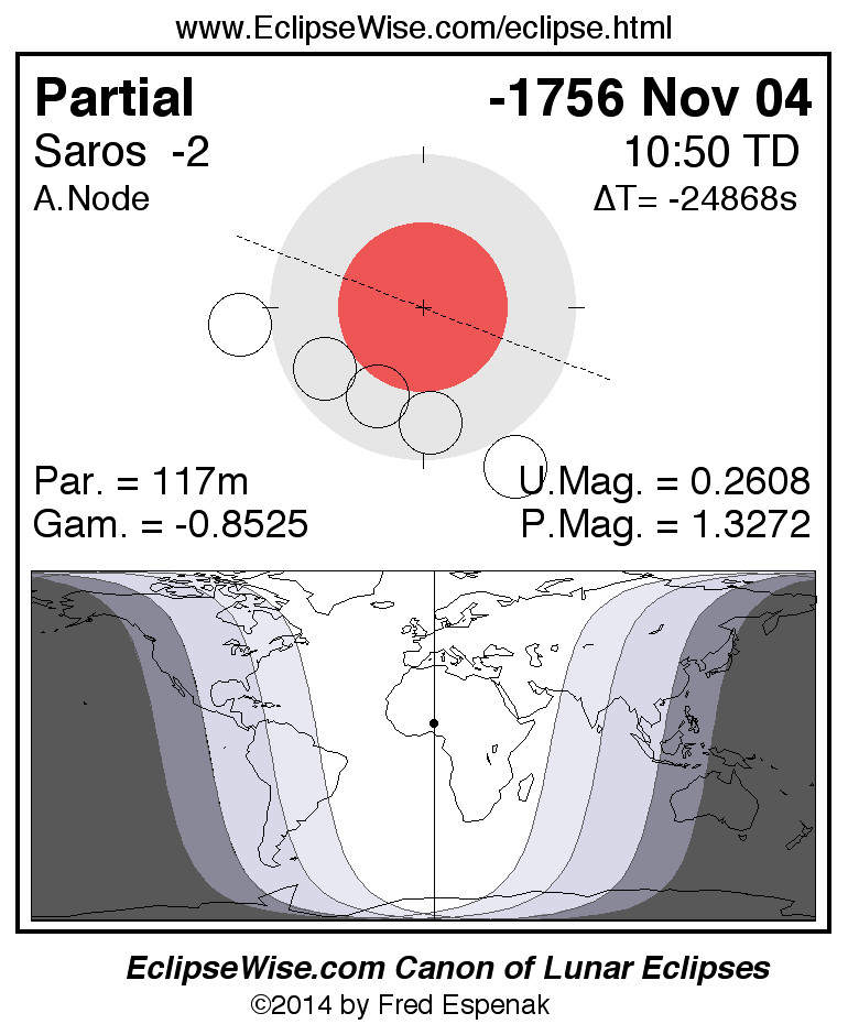 The instant of greatest eclipse takes place on -1756 Nov 04 at 10:49:55 TD (23:32:12 UT1).