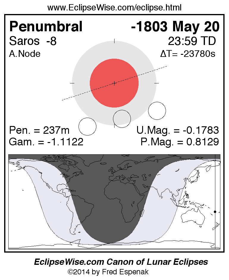 Another lunar eclipse occurs one synodic month after the -1803 May 20 eclipse. It is the penumbral lunar eclipse of -1803 Jun 19.