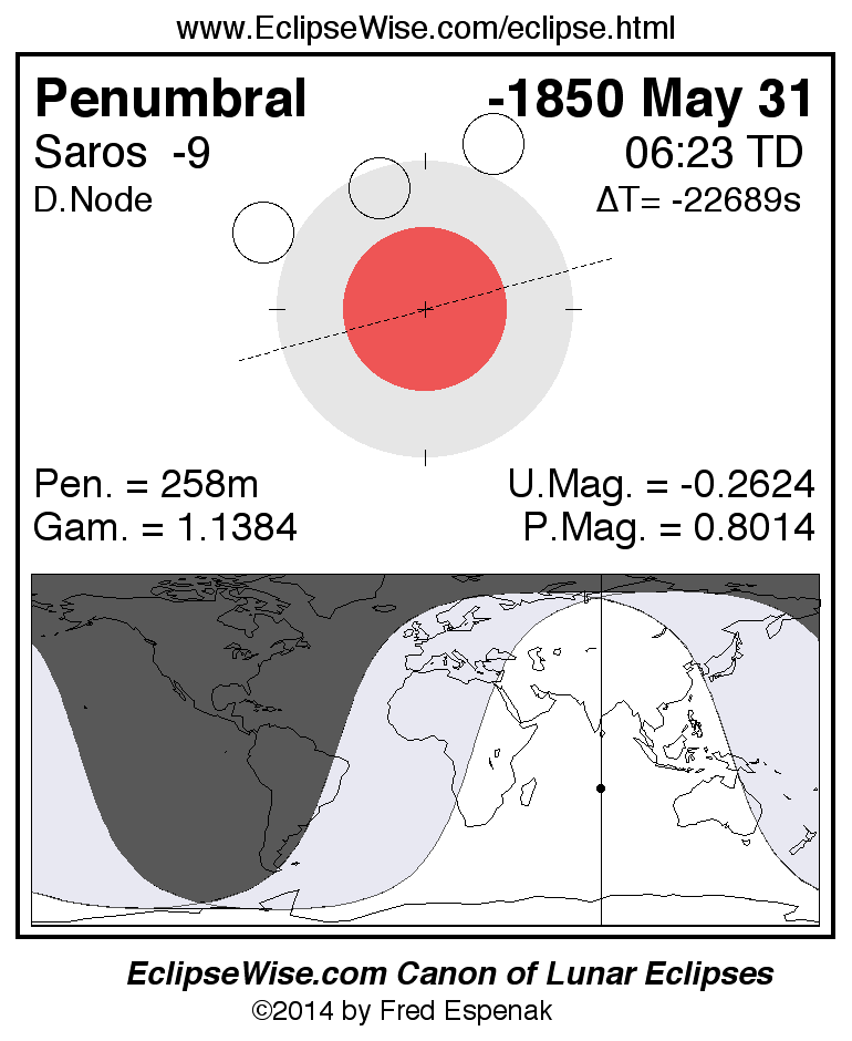 The penumbral lunar eclipse of -1850 May 31 is followed two weeks later by a total solar eclipse on -1850 Jun 14.