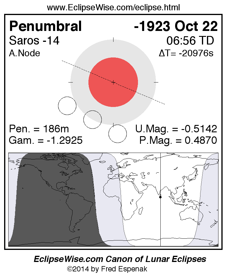 Another lunar eclipse occurs one synodic month after the -1923 Oct 22 eclipse. It is the penumbral lunar eclipse of -1923 Nov 20.