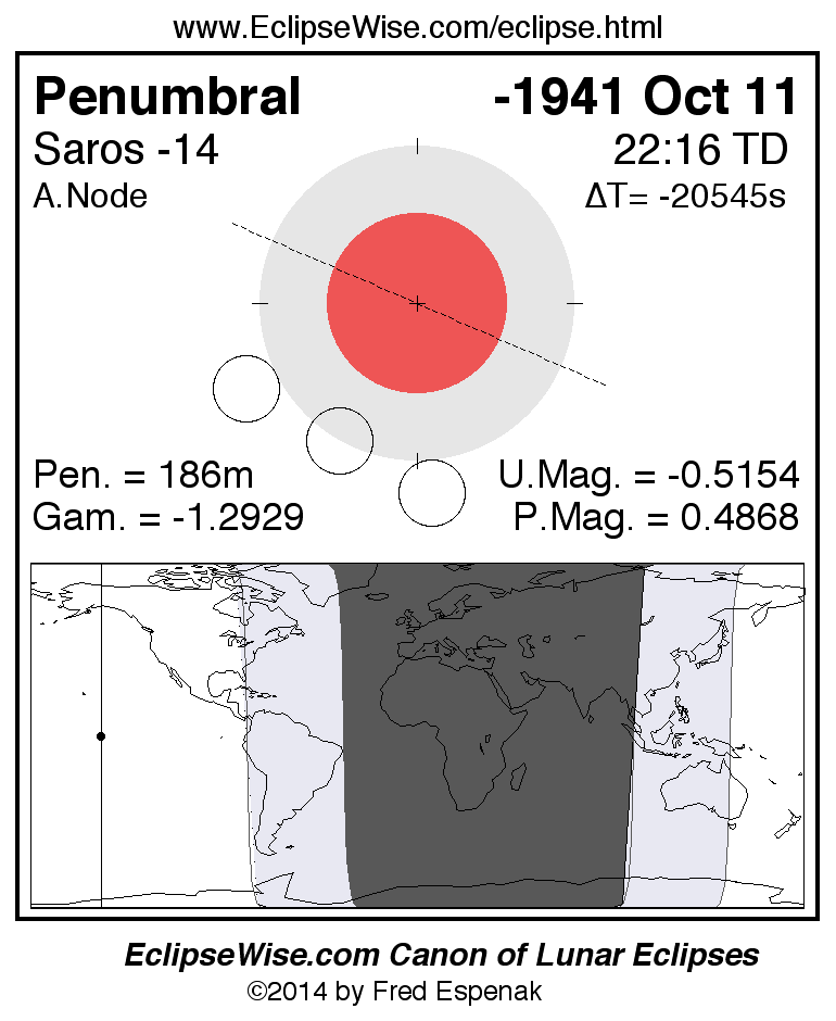 Another lunar eclipse occurs one synodic month after the -1941 Oct 11 eclipse. It is the penumbral lunar eclipse of -1941 Nov 10.