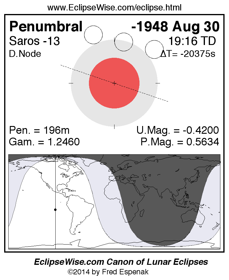 Another lunar eclipse occurs one synodic month after the -1948 Aug 30 eclipse. It is the penumbral lunar eclipse of -1948 Sep 29.