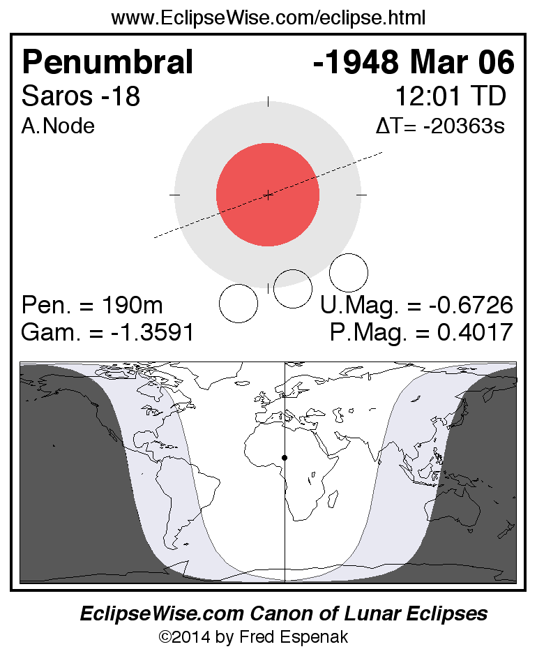 Another lunar eclipse occurs one synodic month after the -1948 Mar 06 eclipse. It is the penumbral lunar eclipse of -1948 Apr 05.