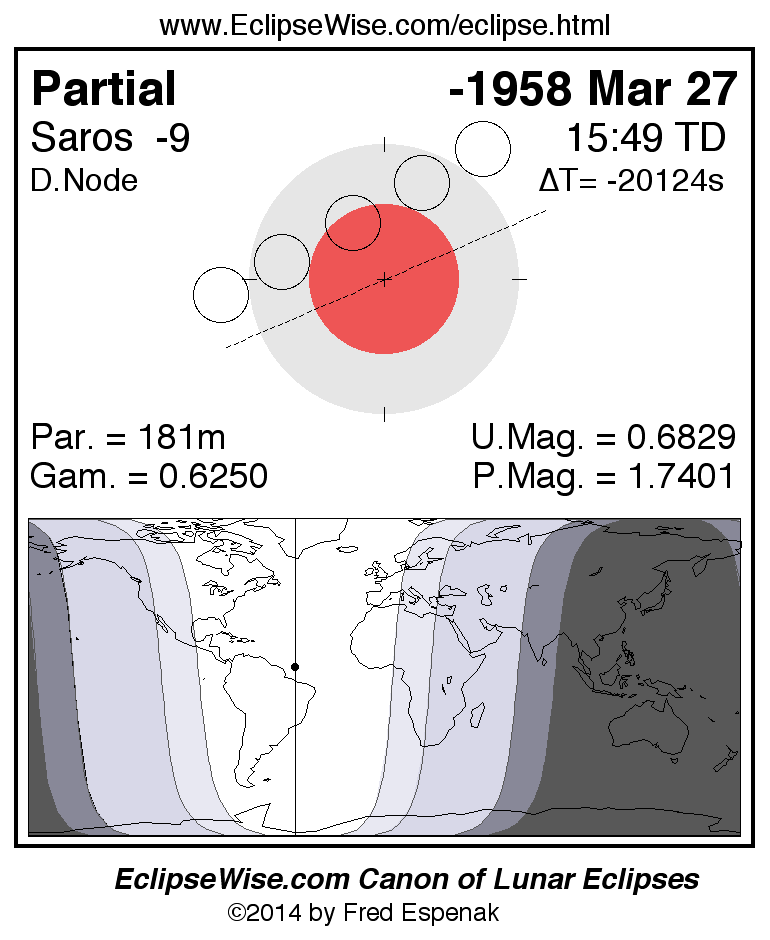 The partial lunar eclipse of -1958 Mar 27 is followed two weeks later by a total solar eclipse on -1958 Apr 10.