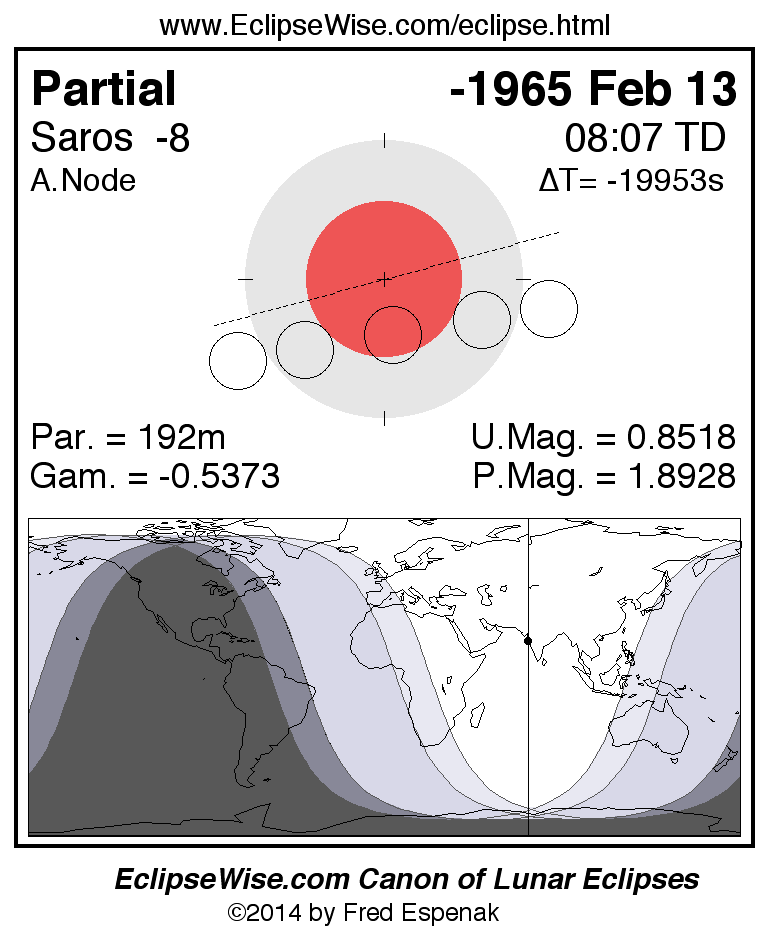 The instant of greatest eclipse takes place on -1965 Feb 13 at 08:07:15 TD (19:27:38 UT1).