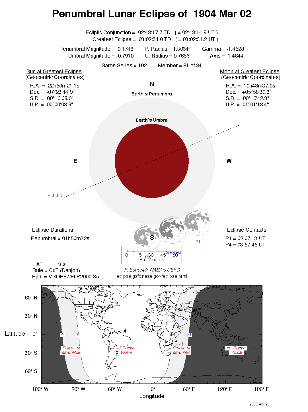 The tables below contain detailed predictions and additional information on the Penumbral Lunar Eclipse of 1904 Mar 02 .