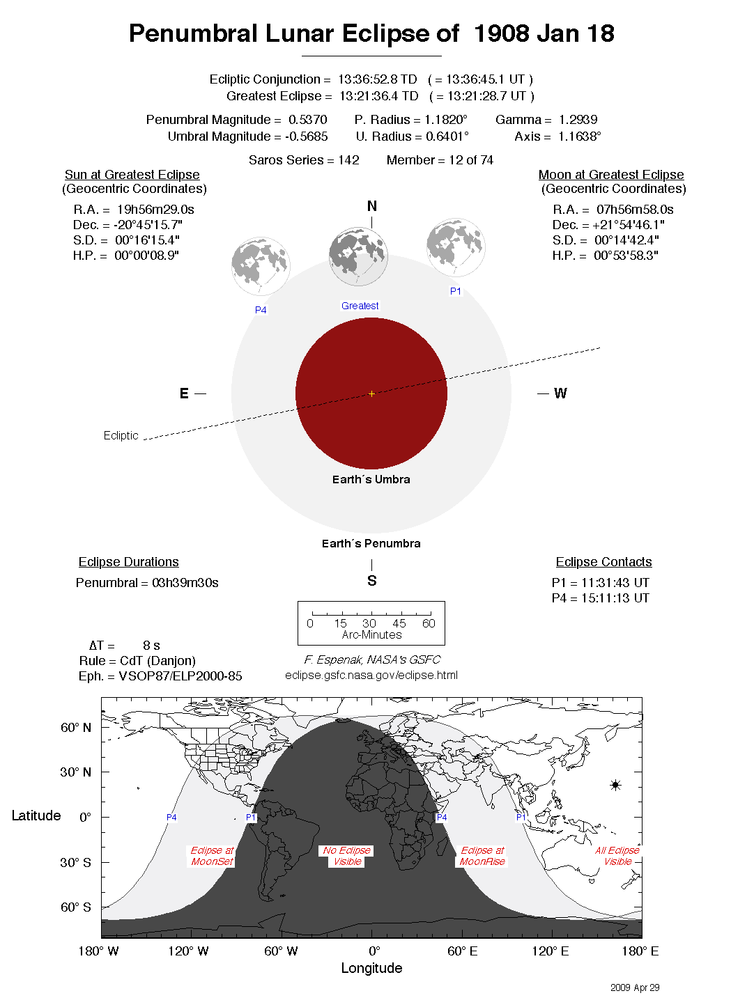 The tables below contain detailed predictions and additional information on the Penumbral Lunar Eclipse of 1908 Jan 18 .