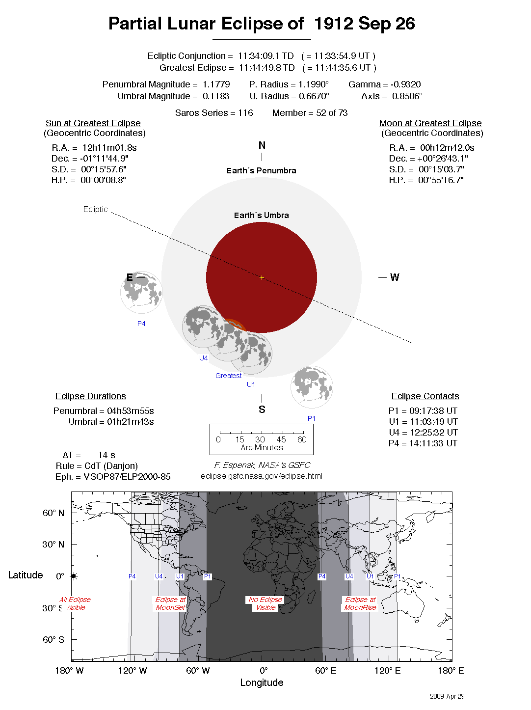 The tables below contain detailed predictions and additional information on the Partial Lunar Eclipse of 1912 Sep 26 .