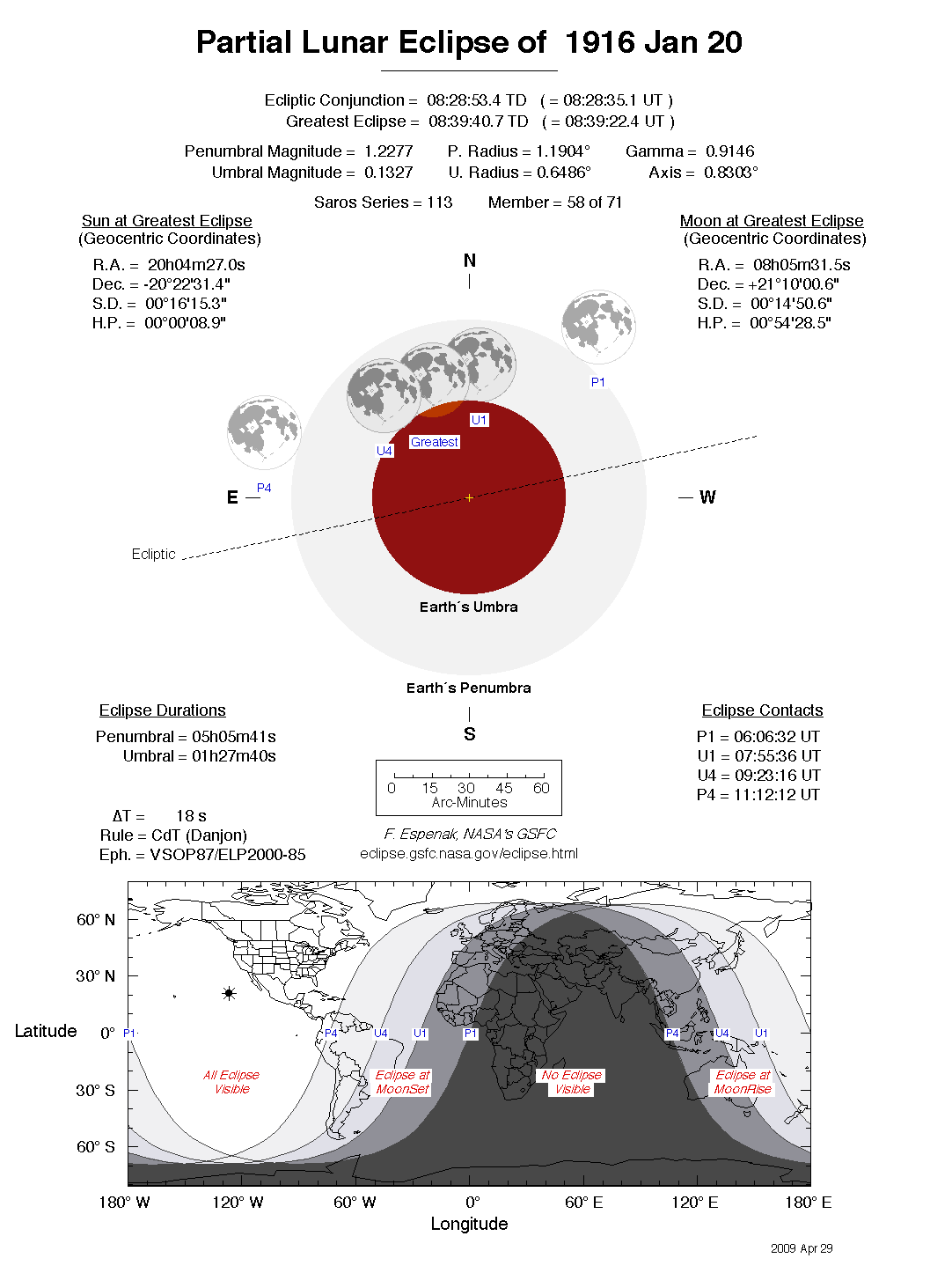 The tables below contain detailed predictions and additional information on the Partial Lunar Eclipse of 1916 Jan 20 .