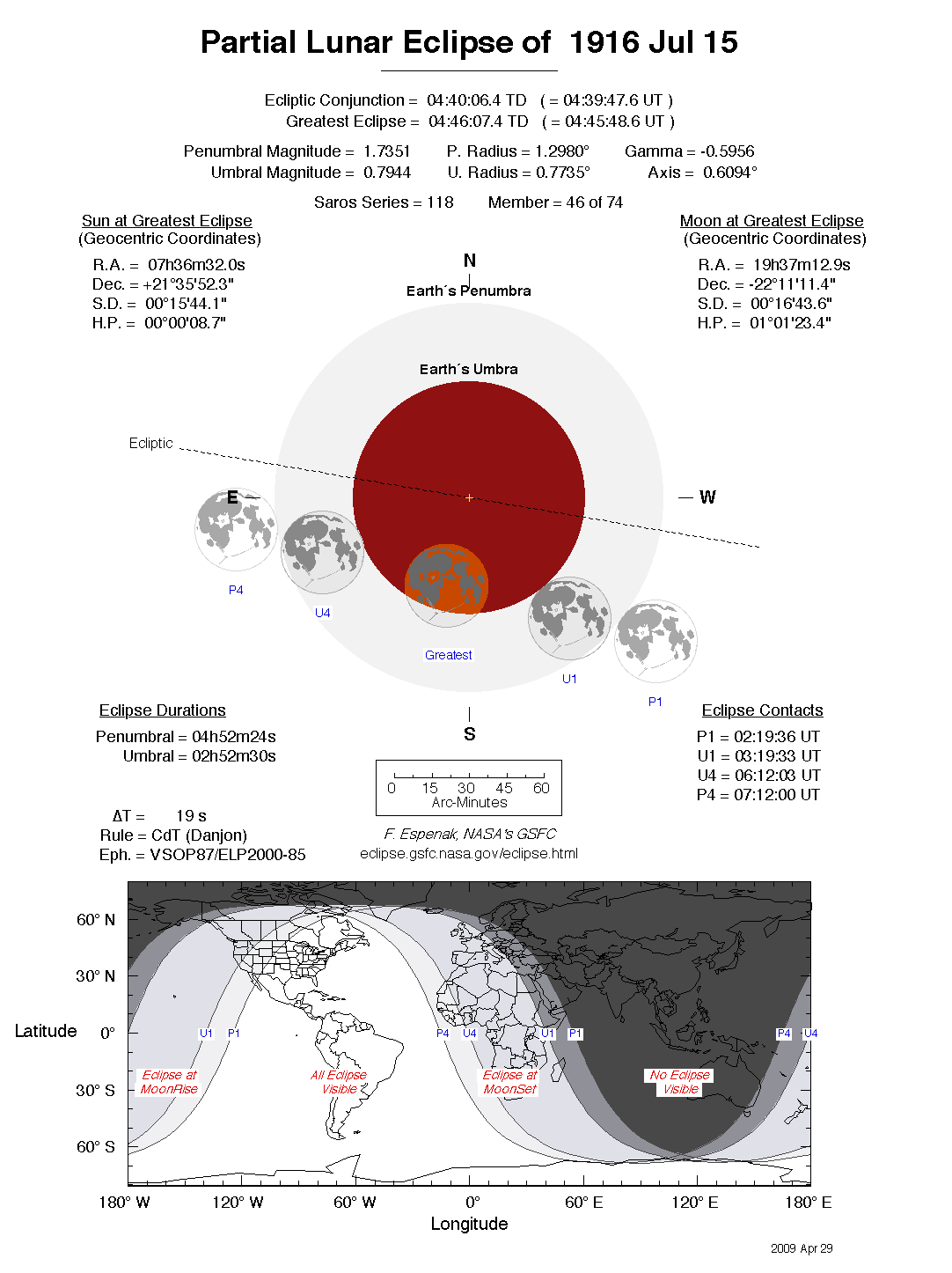 The tables below contain detailed predictions and additional information on the Partial Lunar Eclipse of 1916 Jul 15 .