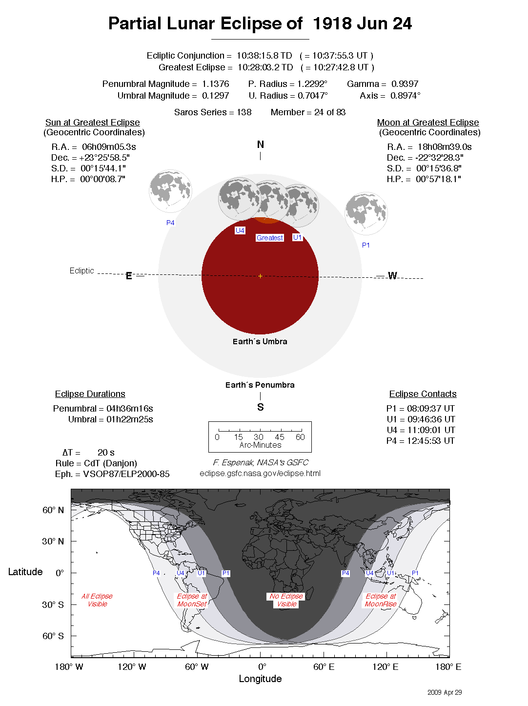 The tables below contain detailed predictions and additional information on the Partial Lunar Eclipse of 1918 Jun 24 .
