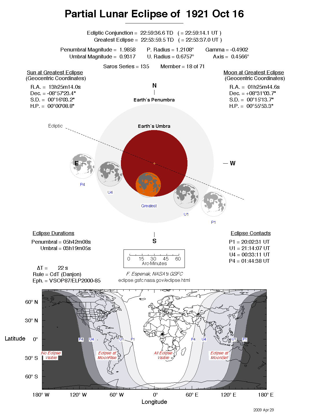 The tables below contain detailed predictions and additional information on the Partial Lunar Eclipse of 1921 Oct 16 .