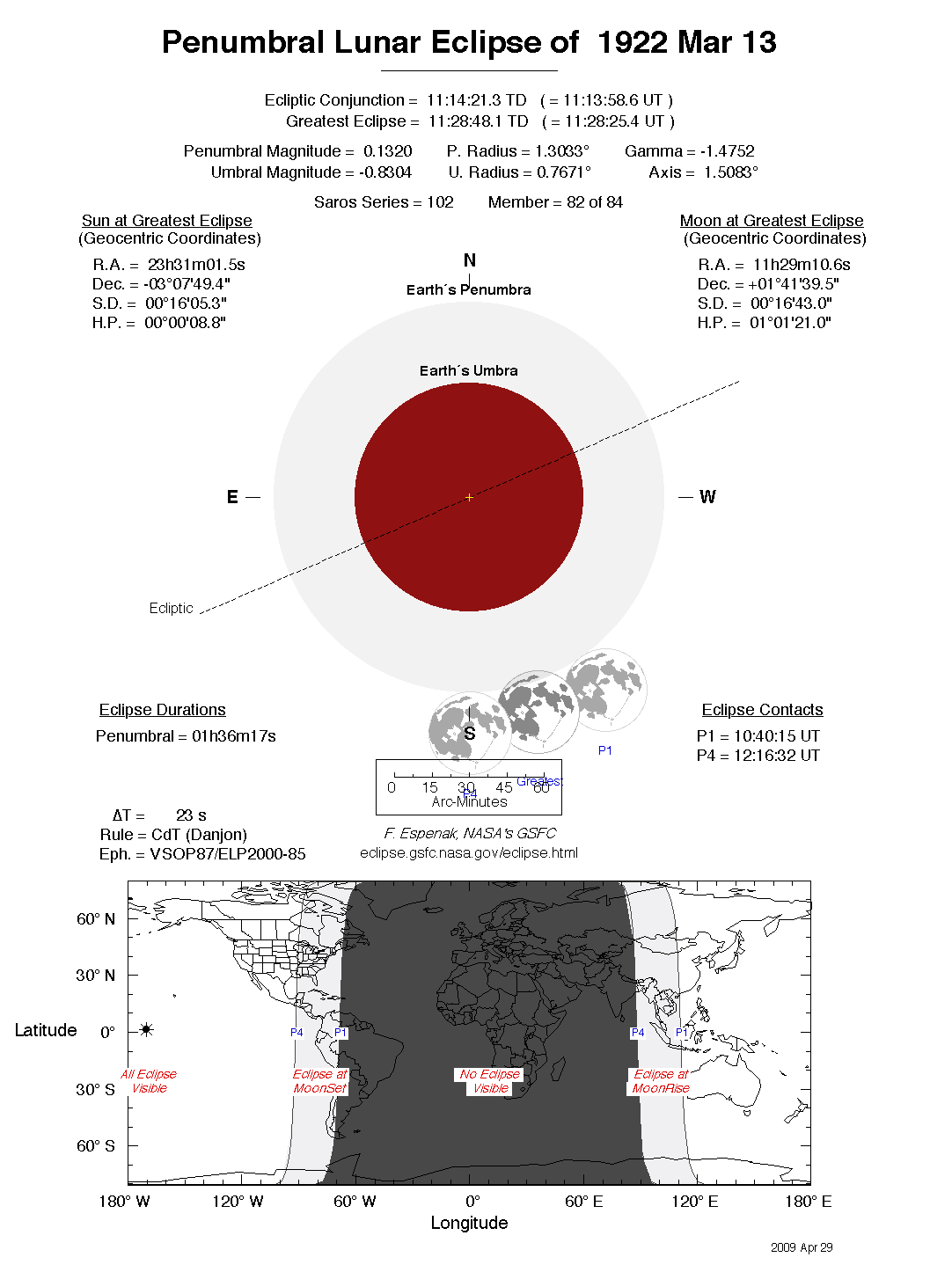 The tables below contain detailed predictions and additional information on the Penumbral Lunar Eclipse of 1922 Mar 13 .