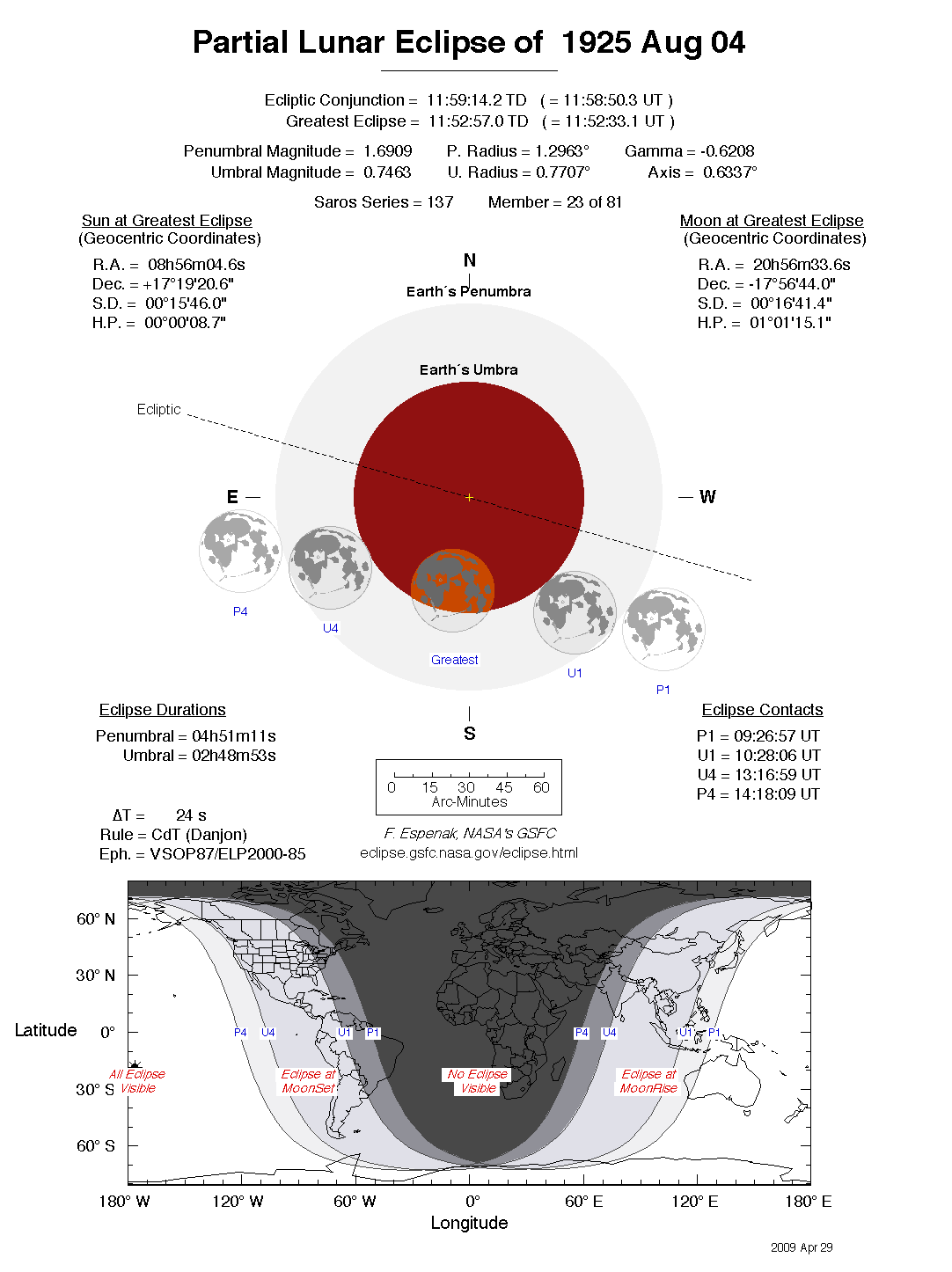 The tables below contain detailed predictions and additional information on the Partial Lunar Eclipse of 1925 Aug 04 .