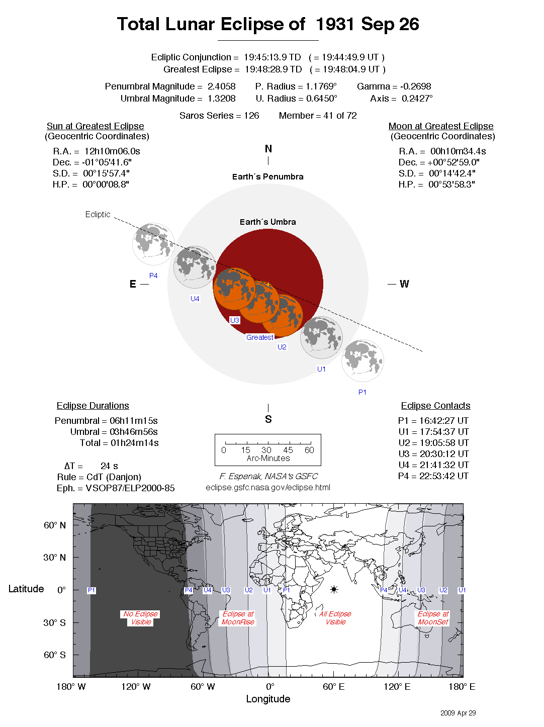 The tables below contain detailed predictions and additional information on the Total Lunar Eclipse of 1931 Sep 26 .