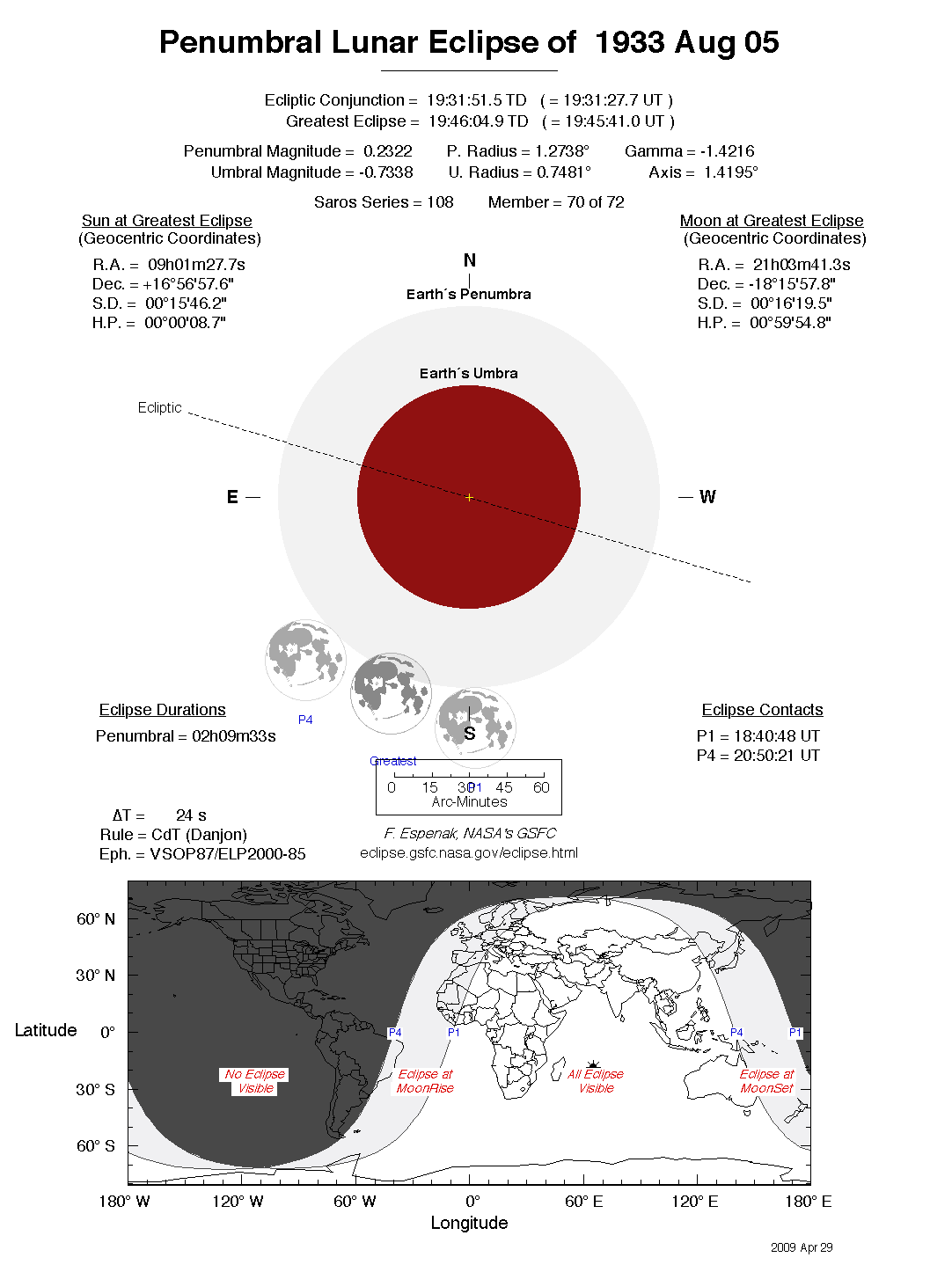 The tables below contain detailed predictions and additional information on the Penumbral Lunar Eclipse of 1933 Aug 05 .
