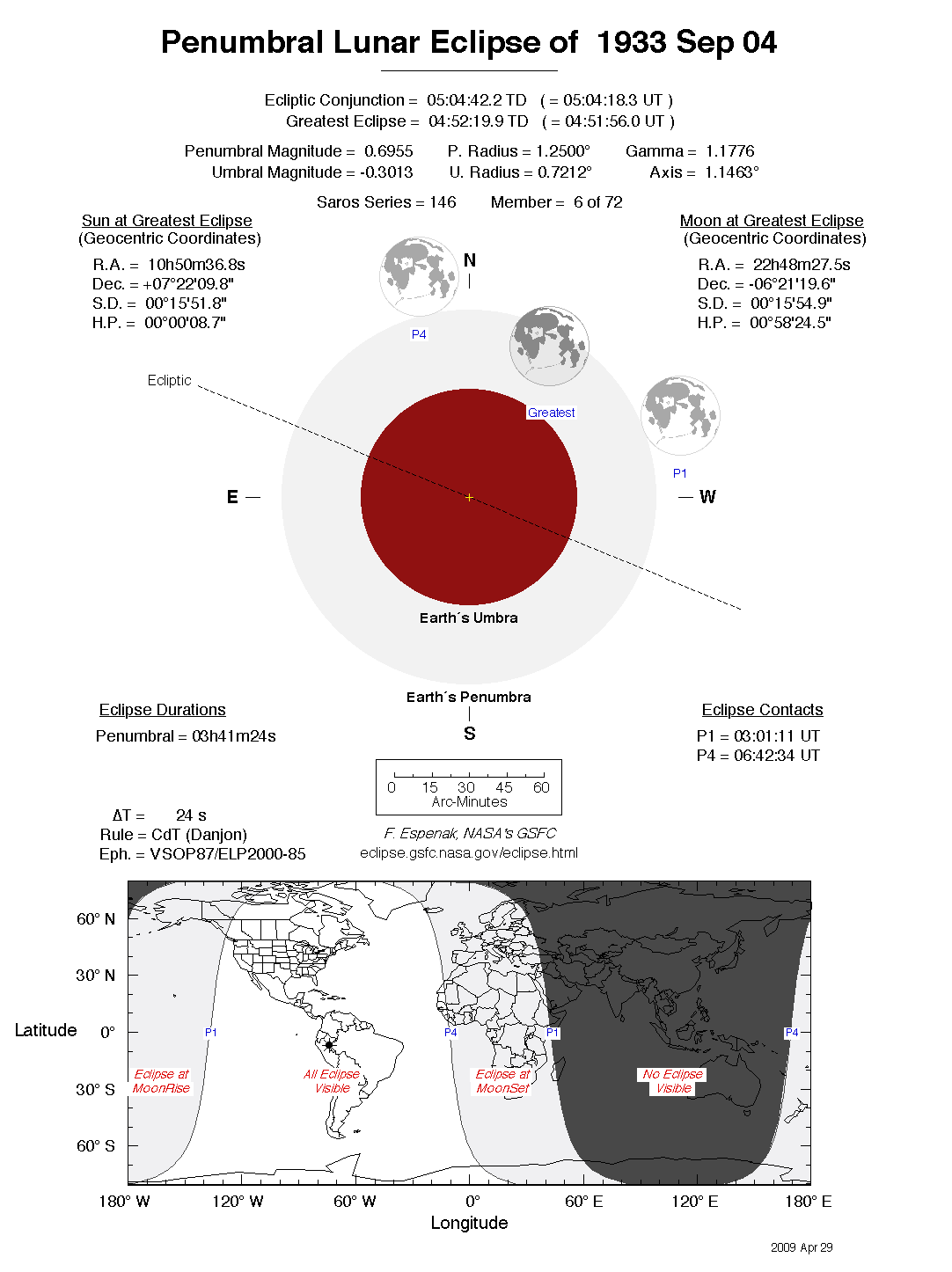 The tables below contain detailed predictions and additional information on the Penumbral Lunar Eclipse of 1933 Sep 04 .