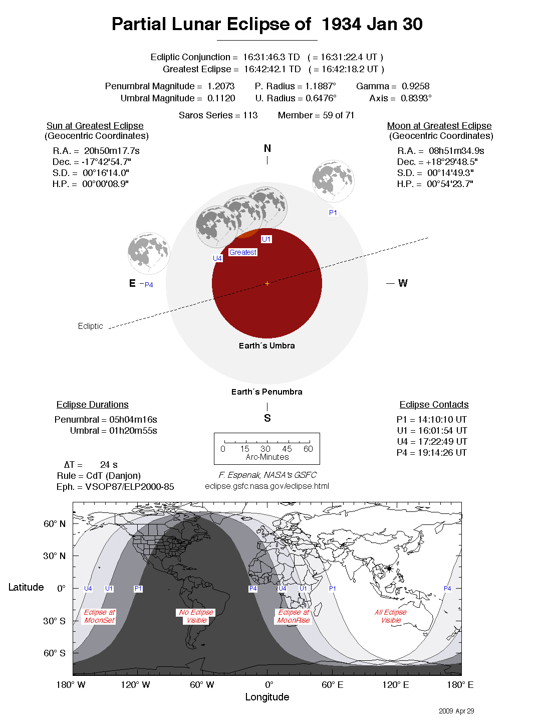 The tables below contain detailed predictions and additional information on the Partial Lunar Eclipse of 1934 Jan 30 .