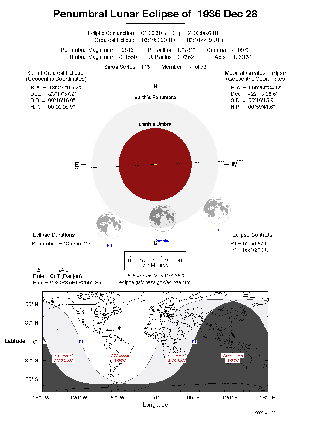 The tables below contain detailed predictions and additional information on the Penumbral Lunar Eclipse of 1936 Dec 28 .