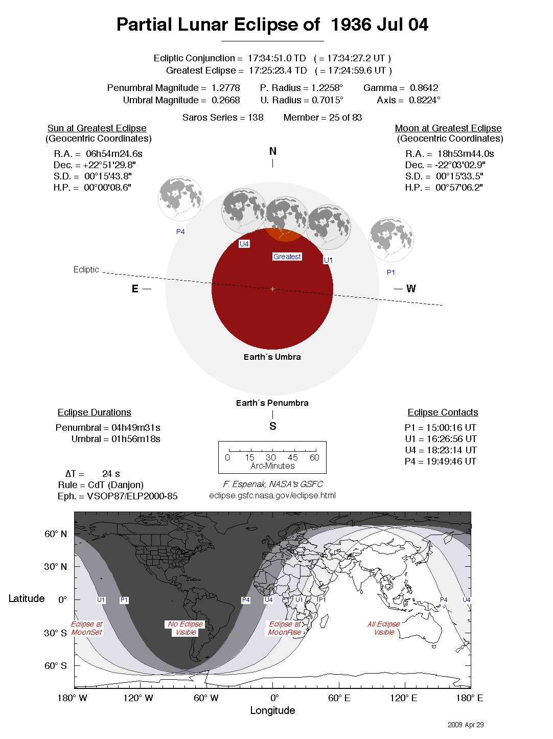 The tables below contain detailed predictions and additional information on the Partial Lunar Eclipse of 1936 Jul 04 .