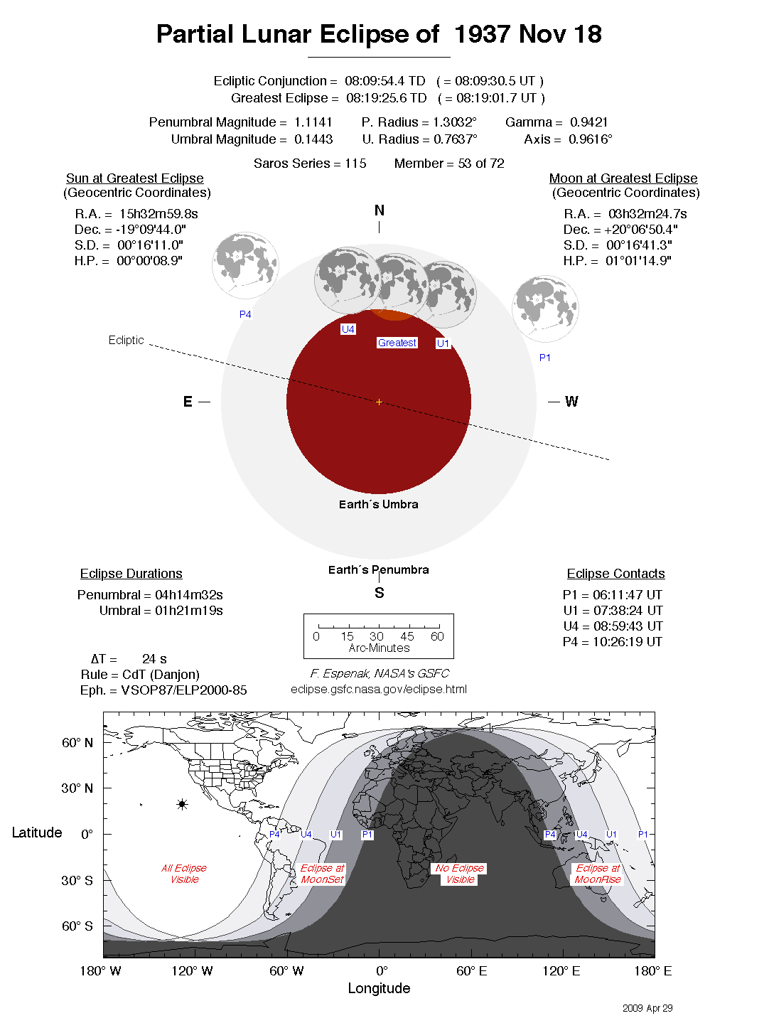 The tables below contain detailed predictions and additional information on the Partial Lunar Eclipse of 1937 Nov 18 .