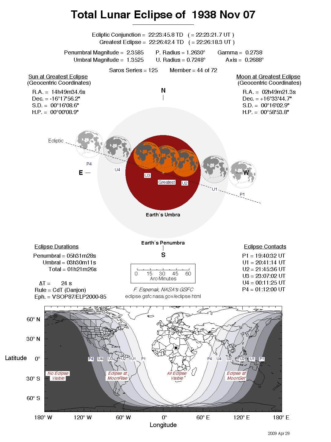The tables below contain detailed predictions and additional information on the Total Lunar Eclipse of 1938 Nov 07 .