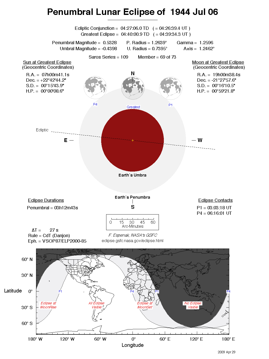 The tables below contain detailed predictions and additional information on the Penumbral Lunar Eclipse of 1944 Jul 06 .