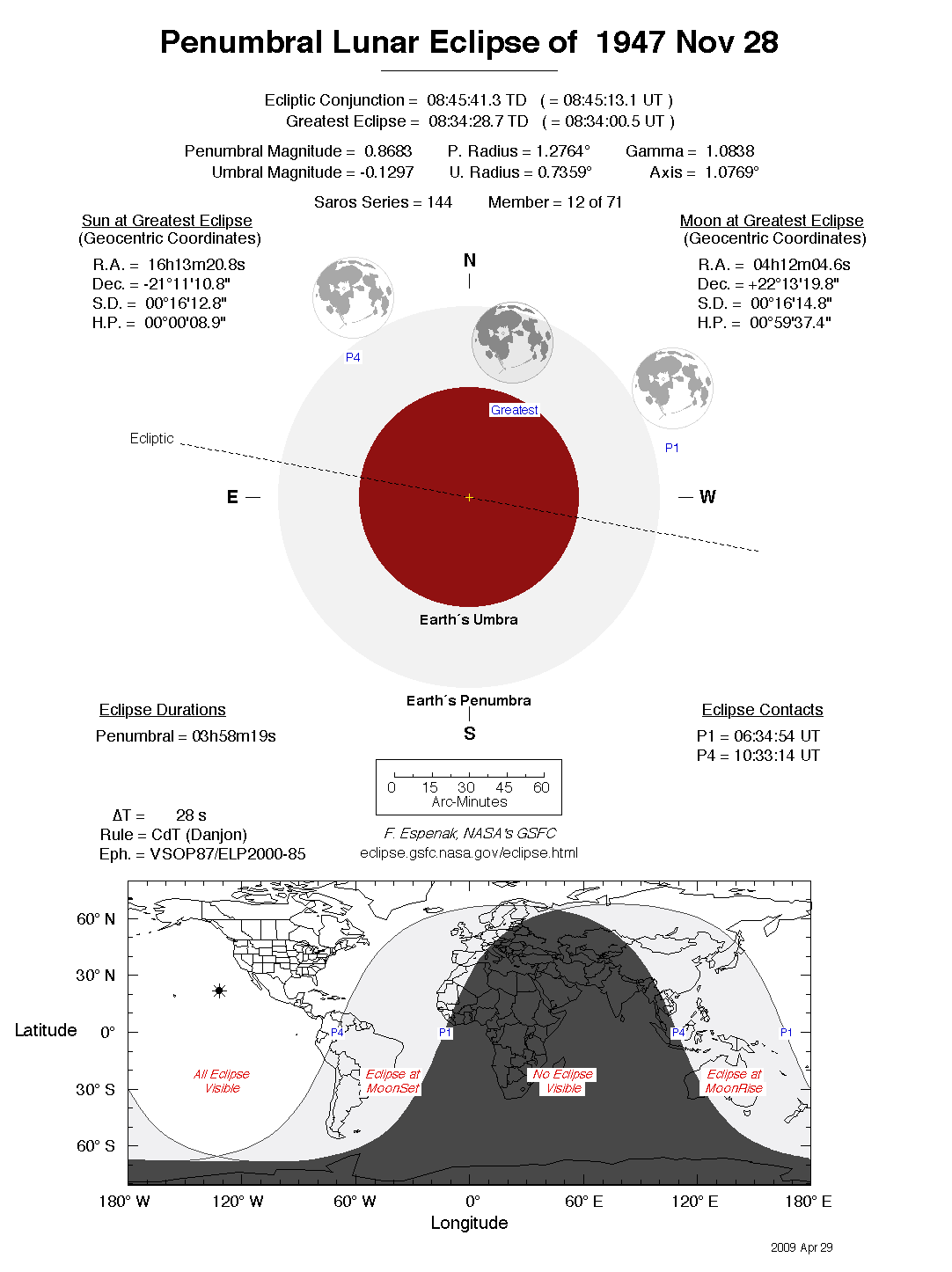 The tables below contain detailed predictions and additional information on the Penumbral Lunar Eclipse of 1947 Nov 28 .