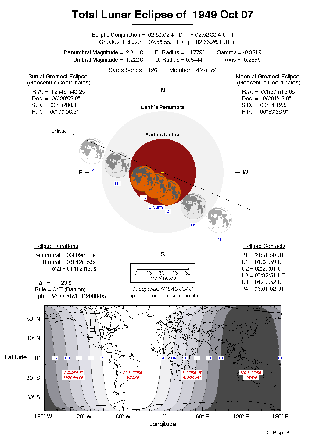 The tables below contain detailed predictions and additional information on the Total Lunar Eclipse of 1949 Oct 07 .