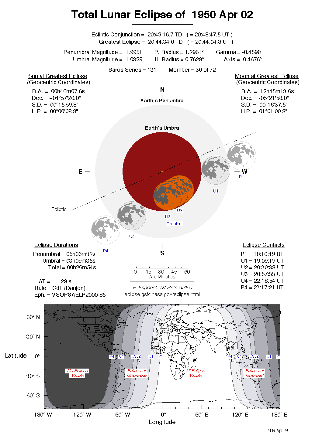 The tables below contain detailed predictions and additional information on the Total Lunar Eclipse of 1950 Apr 02 .