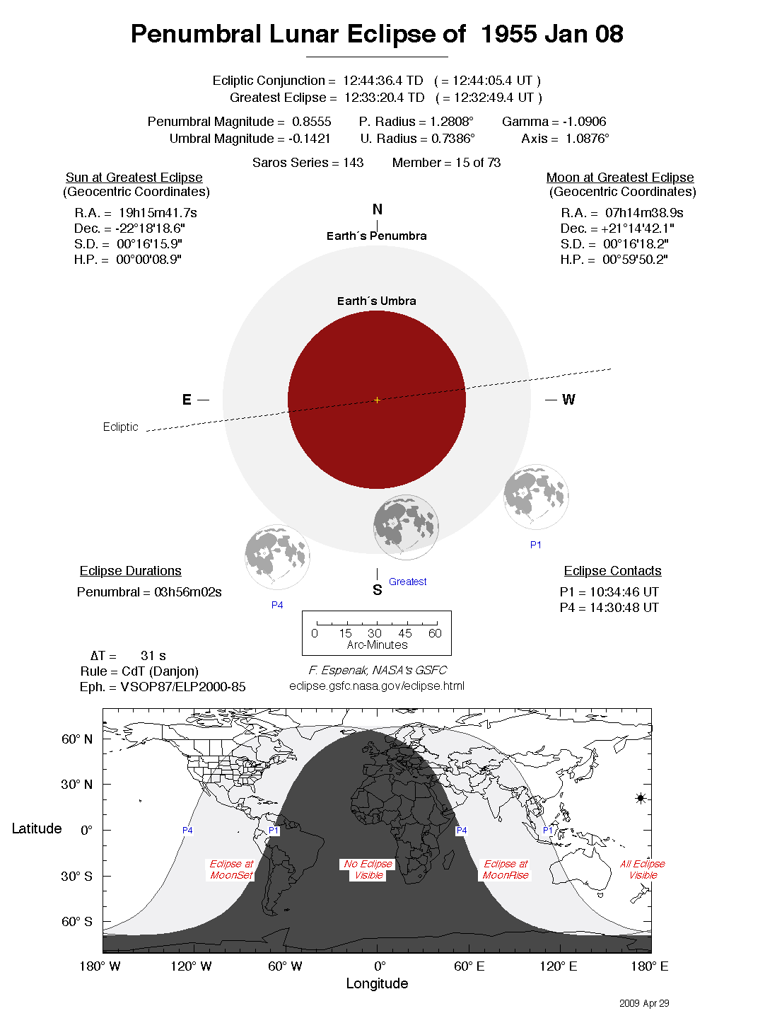 The tables below contain detailed predictions and additional information on the Penumbral Lunar Eclipse of 1955 Jan 08 .