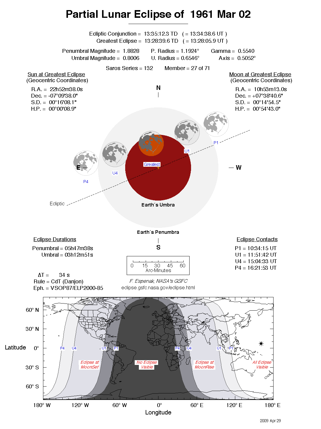 The tables below contain detailed predictions and additional information on the Partial Lunar Eclipse of 1961 Mar 02 .